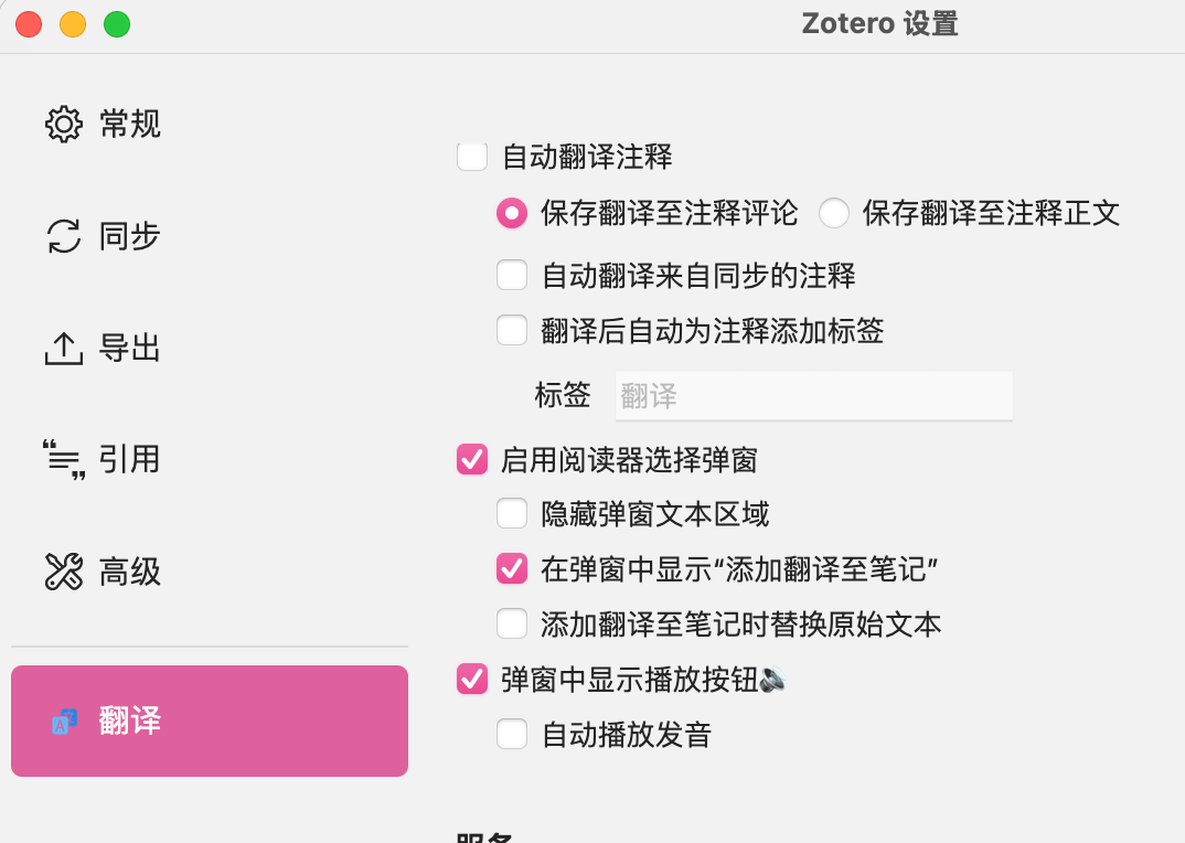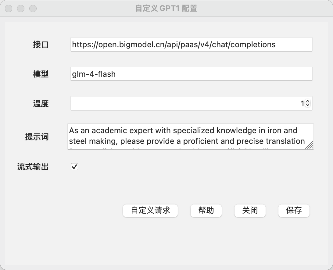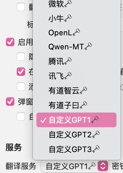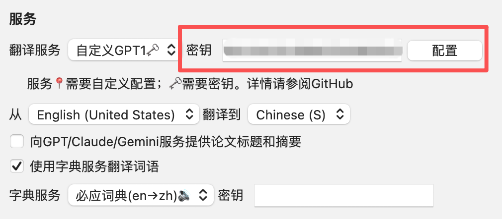 该 Zotero 翻译插件内置了数十种翻译服务,其具体配置方式可以在官方文档中查阅。除此之外,插件还提供了一个额外的 GPT 接口,我们可以通过 API 调用自己希望使用的模型,从而替代传统的机器翻译服务。