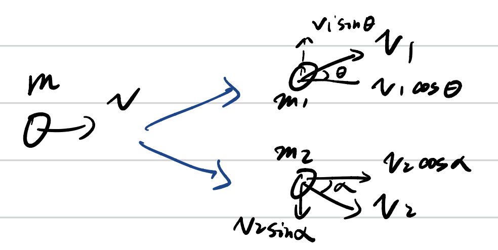 - 竖直方向:$ m_1v_1\sin\theta = m_2v_2\sin\alpha $