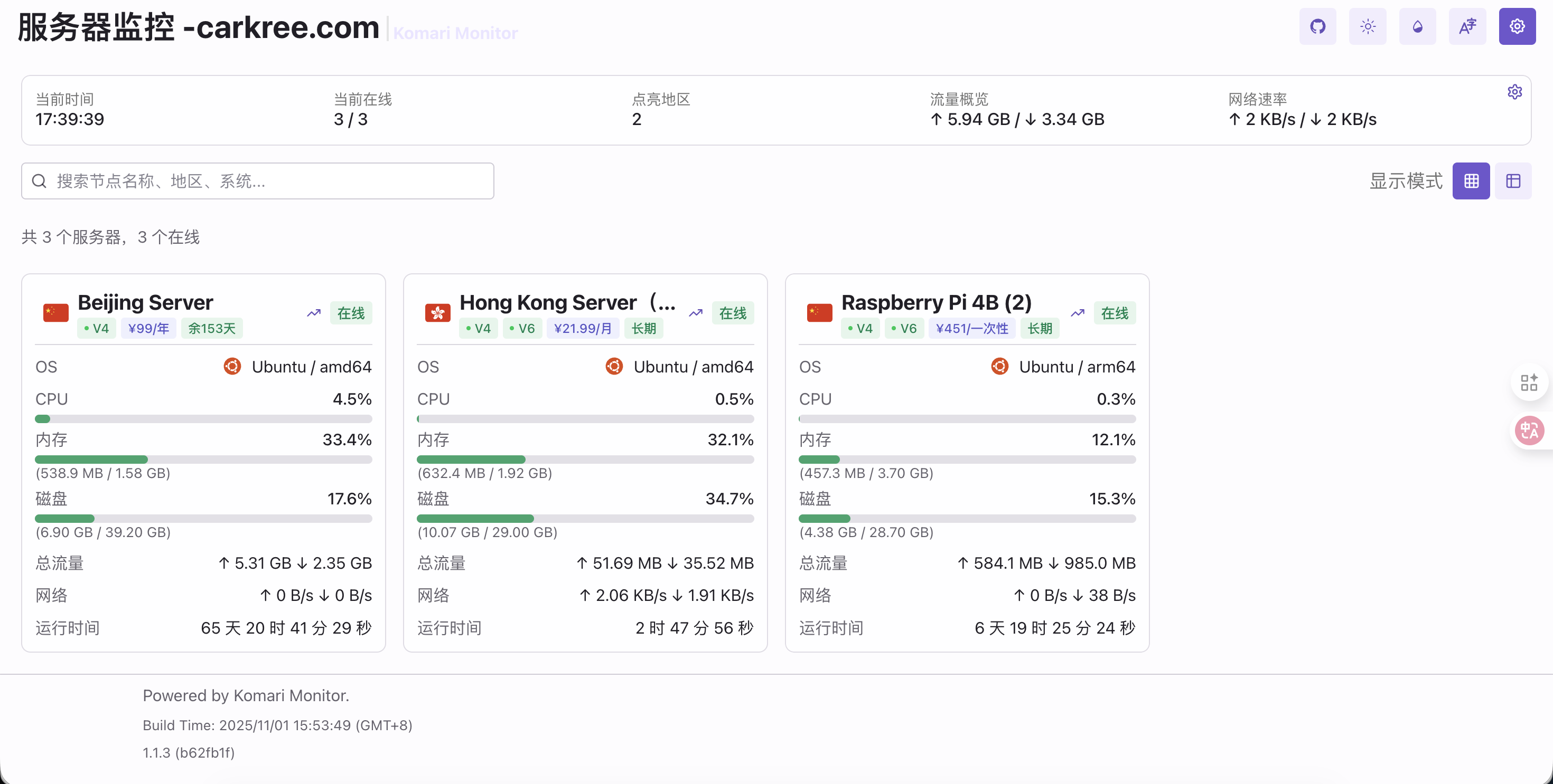 Komari 是一款轻量级的自托管服务器监控工具,旨在提供简单、高效的服务器性能监控解决方案。它支持通过Web 界面查看服务器状态,并通过轻量级 Agent 收集数据。Komari 的特点包括低资源占用,适合各种规模的服务器,用户可以完全掌控数据隐私,且部署过程简单。
