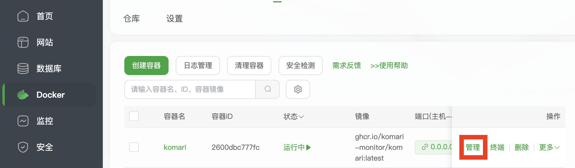 打开宝塔面板,左侧边栏选择docker,点击容器,点击相应容器名后面的“管理”