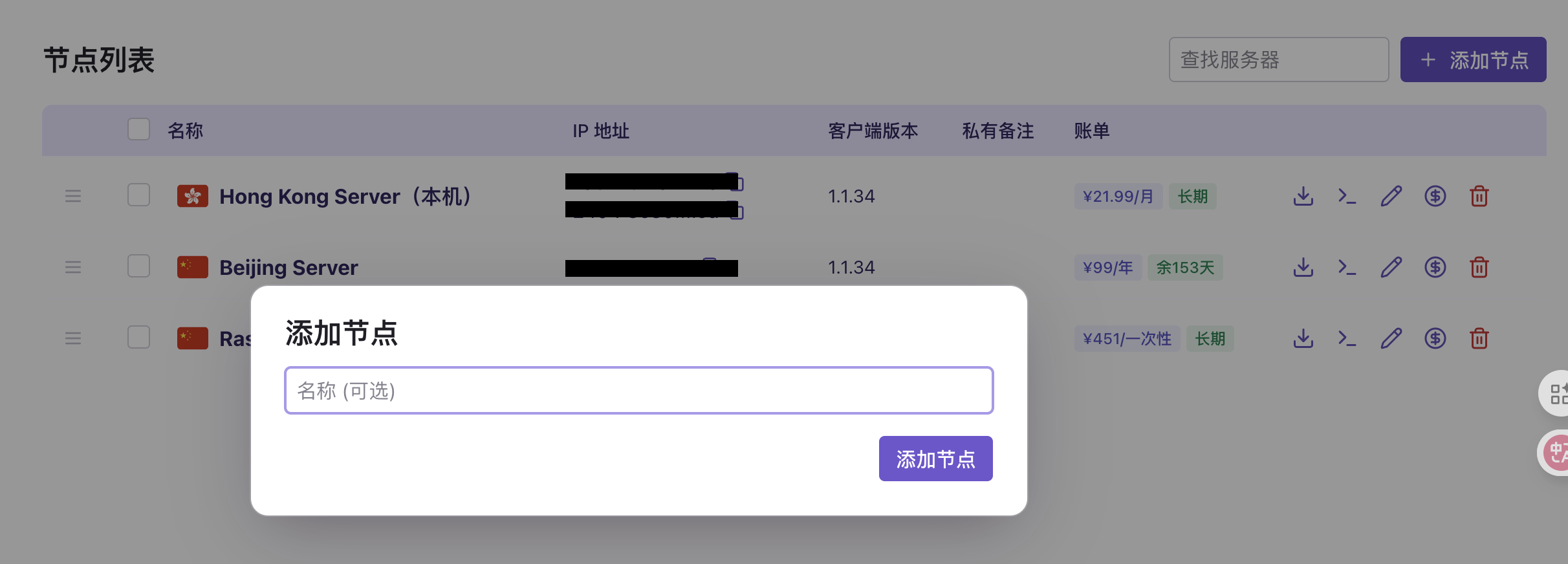首先需要在Dashboard添加一个节点。 进入后台,选择“服务器“,接着点击右侧的”添加节点“,输入节点名称,就会出现需要执行的命令及相关选项