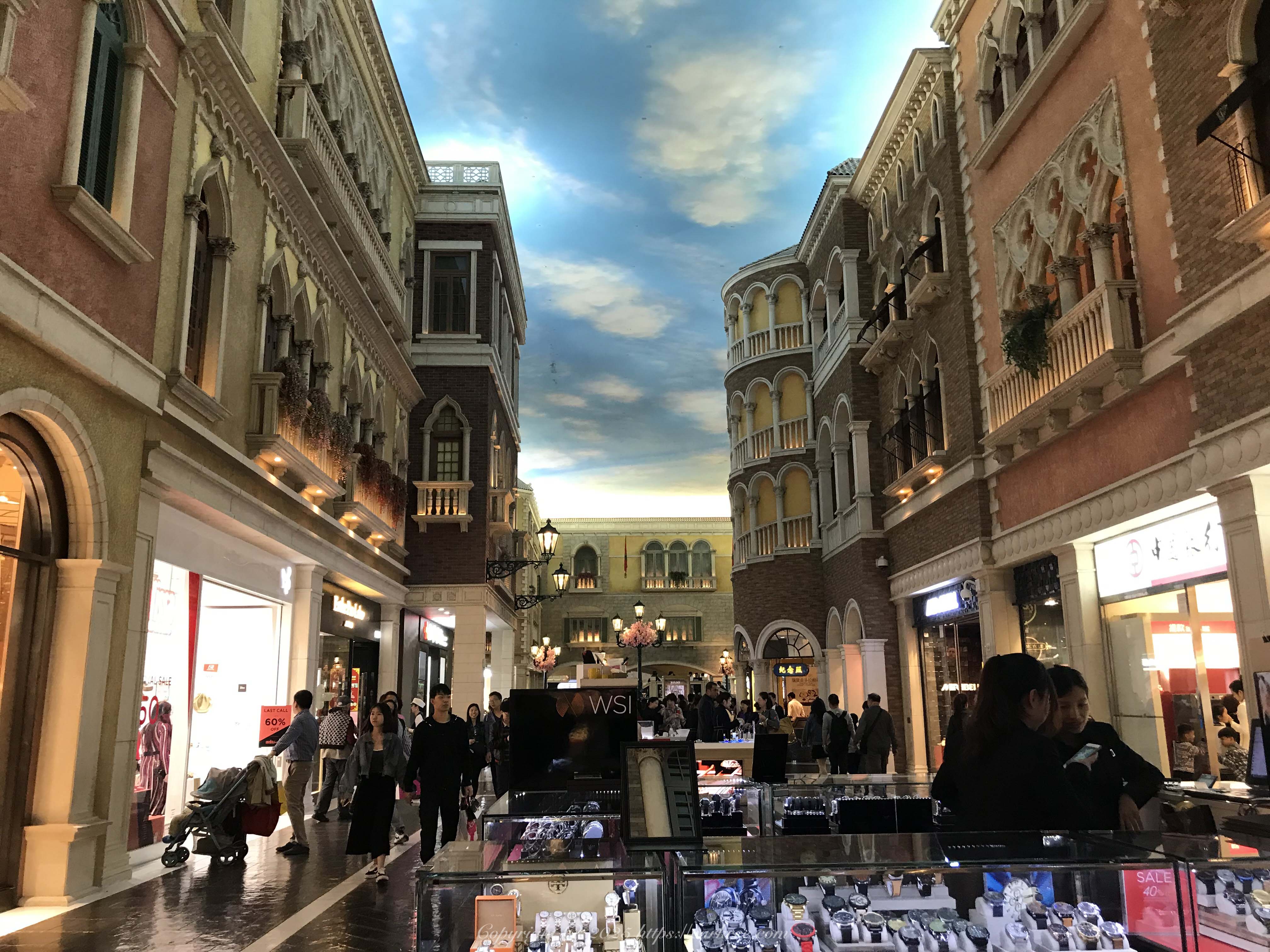 威尼斯人最著名的还是那个假天空的购物街,我这次没有拍照,拿一张2019年我在这里拍的照片凑数,毕竟六年过去了一点变化也没有(使用iPhone7Plus拍摄)