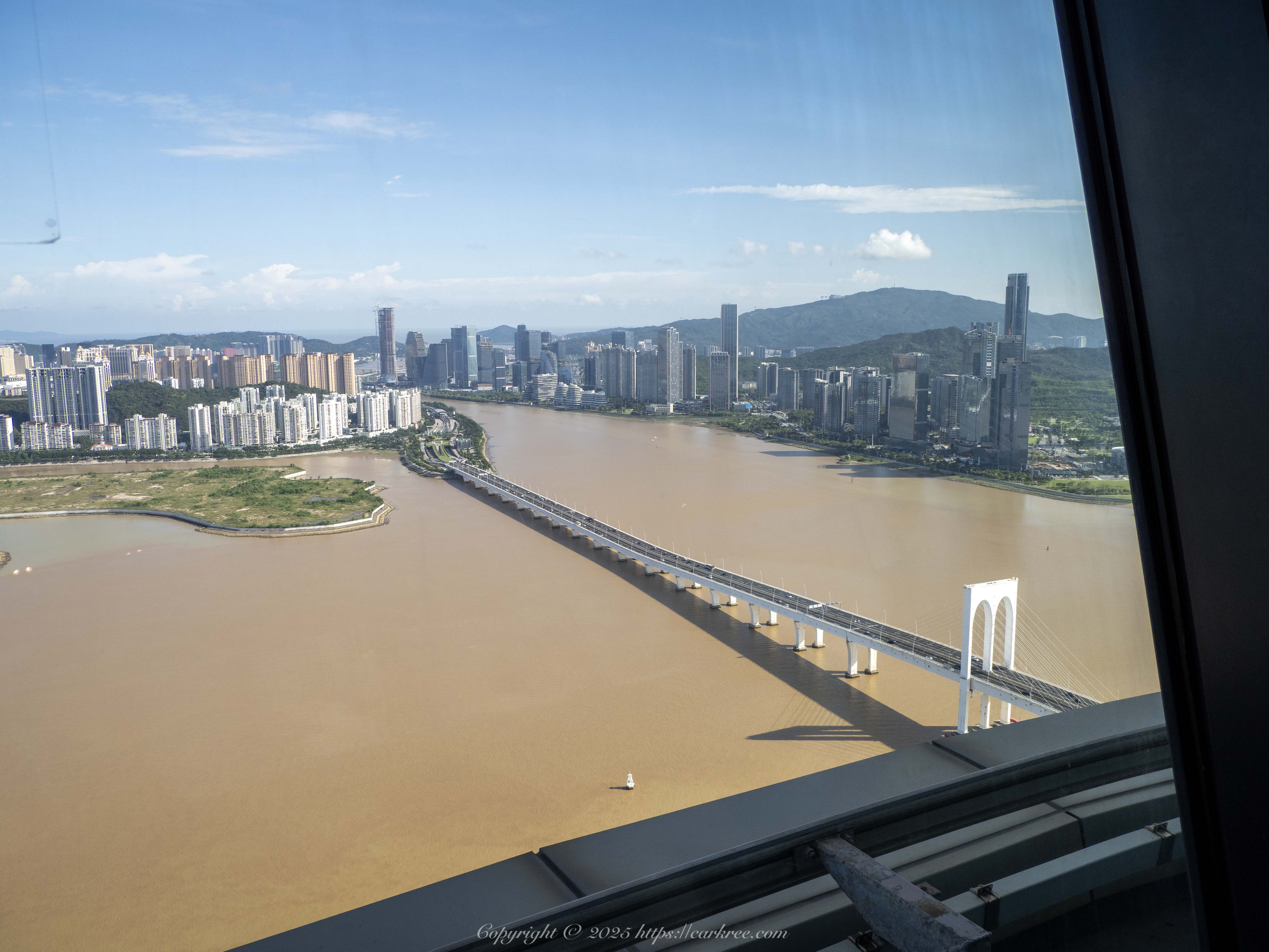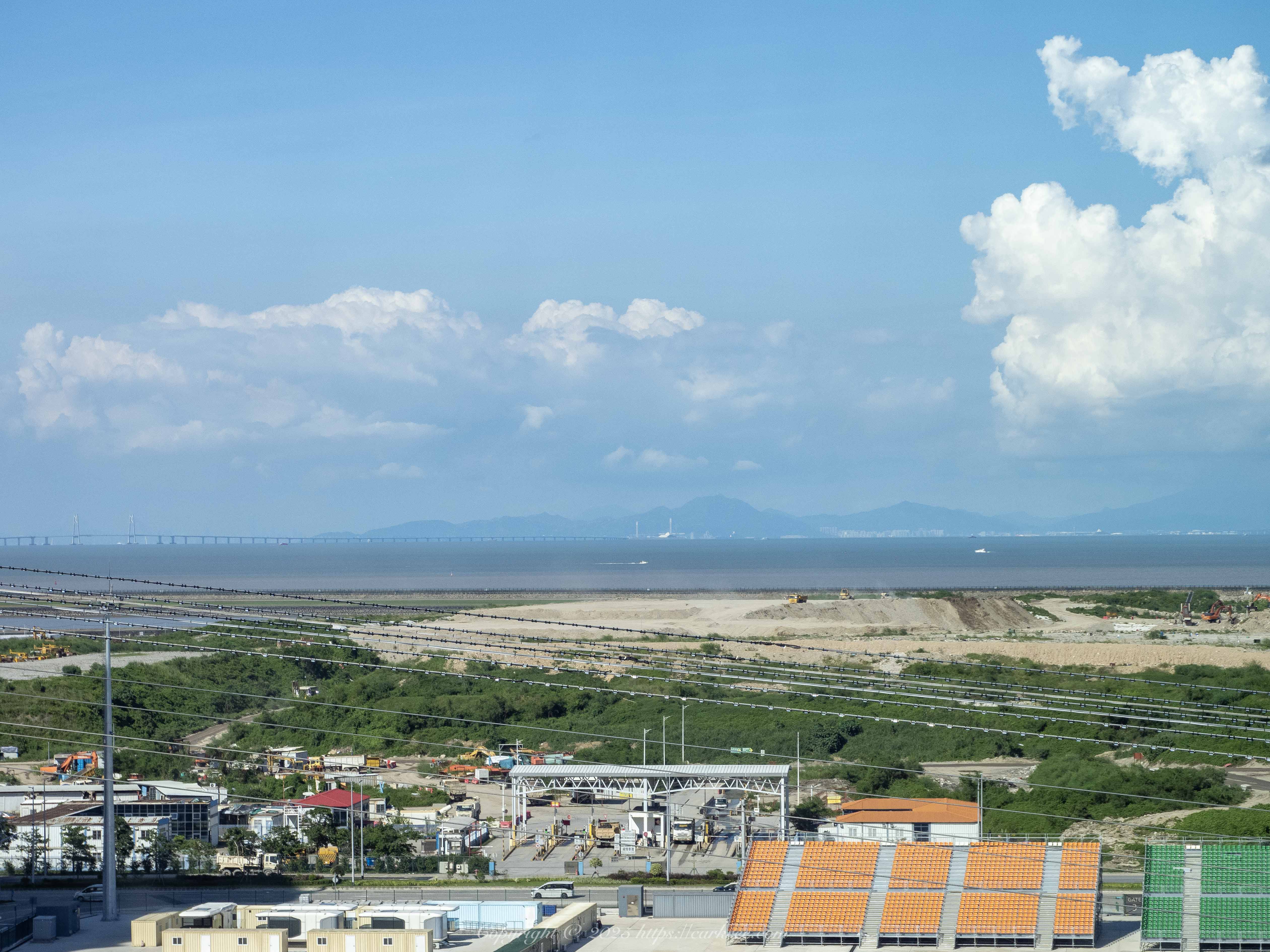 远处的香港离岛区,澳门的海和香港的海的颜色有一条明显的分界线: